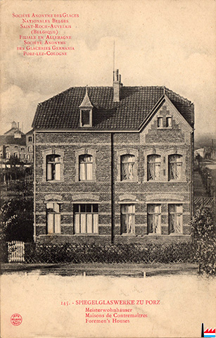 Spiegelglaswerke zu Porz: Verwaltungsgebäude, Seite zur Kolonie (Postkarte: