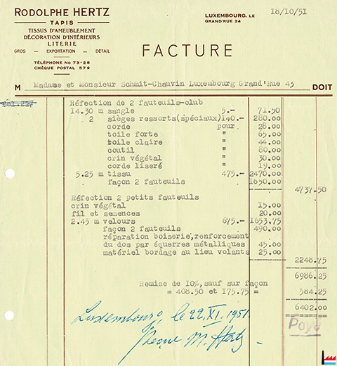 1946 | De retour des États-Unis, Rodolphe et Emilie HERTZ ouvrent sous l’enseigne de « Rodolphe HERTZ », un commerce de tapis et rideaux au premier étage de l’immeuble situé au 9, Grand’Rue à Luxembourg. |