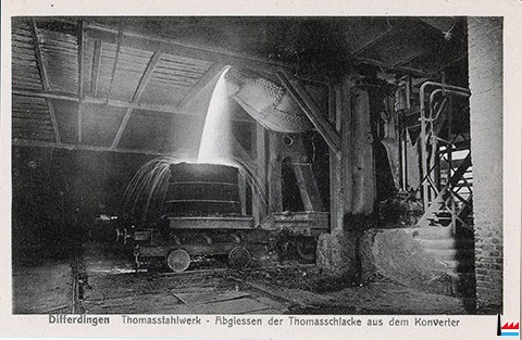 Hütte Differdingen - Thomasstahlwerk - Abgiessen der Thomasschlacke aus dem Konverter (Carte postale: Verlag Ch. Grieser, Hofphotograph, Luxemburg, 1916; collection: industrie.lu)