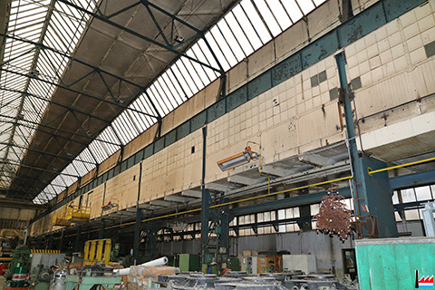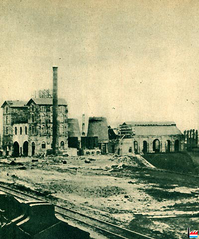 2 mélangeurs, d'une capacité unitaire de 1.000 t. 5 convertisseurs Thomas, d'une capacité de 32 t chacun, et le nouveau convertisseur LD-AC de 70 t. Dans la halle de démoulage, les 2 nouveaux fours pits chauffés, Au train blooming, les opérateurs transforment en deux minutes et demie un lingot de 6 t avec une section de 680 x 680 mm en un bloom d'une section carrée de 200 mm. Les cisailles électriques affranchissaient les deux bouts et un pont rotatif automatisé poset le bloom sur le train d'amenée du train à billettes. Les fours des vieux trains finisseurs Le nouveau train à billettes transforme un bloom de 200 mm, à travers huit cages, en billettes de 80 mm. Ces billettes sortent à une vitesse de 2 m/sec, et sont découpées automatiquement en barres de 9 m. Plus loin, les billettes sont transférées aux refroidisseurs, d'où elles sont reprises par des ponts roulants à aimants et déposées soit aux aires de stockage, soit aux étendages des fours à réchauffer des trains finisseurs. Au-delà des refroidisseurs, l'installation de contrôle à ultrason permet de détecter les défauts à l'intérieur des billettes et d'éliminer les billettes défectueuses. Les fours à réchauffer les billettes avec les installations d'inspection et d'enfournement ont des capacités de 80 t par heure et ils sont chauffés au gaz des hauts fourneaux préchauffé. |