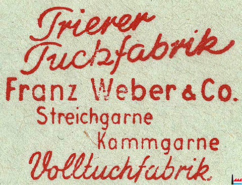 | 11.9.1953 | ![]() Trierer Tuchfabrik, Franz Weber & Co, Trier - 1953 (Collection industrie.lu) Deutsche Bundespost 20 Pfennig + Steuermarke Notopfer Berlin 2 Pfennig |