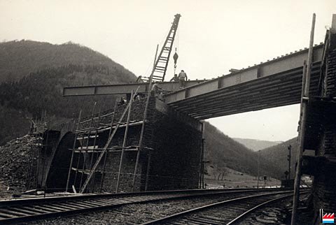 | 1947 | Goebelsmühle. Mit der eingetretenen guten Witterung wird auch wieder fleißig an den zerstörten Eisenbahnbrücken gearbeitet und man rechnet, daß einige für den Monat August in Betrieb genommen werden können. Die Arbeiten werden ausgeführt von der Firma Blaton-Aubert aus Brüssel. (t: 5.4.1947) |