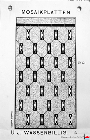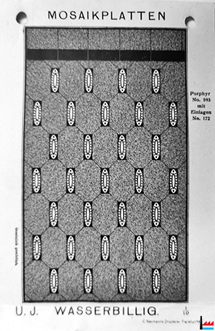 1912 | ![]() ![]() Mosaïkplatten - Verlegepläne von U.J. Wasserbillig - 1912 (Sammlung: Wilhelm Schommer) N° 171, - Porphyr N° 593 mit Einlagen N° 172 |