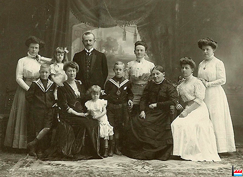 Assis au milieu de la deuxième rangée : M. Raymond de Muyser (* 21.7.1872), ingénieur diplômé, directeur technique à la Société anonyme de l'Usine à cuivre et à tubes, ci-devant E. Rosenkrantz, et Mme Marguerite (Gritty) de Muyser - Wurth (* 25.5.1874). |