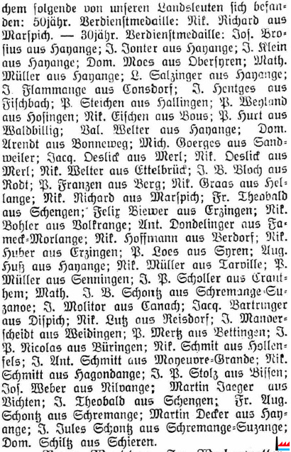 | 9.1927 | Überreichung der Verdienstorden für 50 resp. 30 Dienstjahre an das Personal der de Wendel'schen Werke des Fenschtales in Hayange durch Guy de Wendel, Senator des Moseldepartementes. (LW: 15.10.1927) |