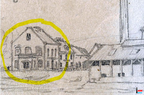 Ancienne fabrique de Roodt s/Syre - vers 1889 - Croquis (8 x 13,5 cm) réalisé par Raymond de Muyser (Collection de Muyser-Huck)