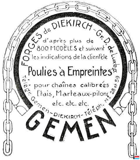 | 11.1907 | Die Eisengießerei der Witwe Vanderaiken ging durch Kauf in die Hände von Edouard Gemen, seit Jahren Chef-Komptable der Firma Majerus und Schoeller von Colmar-Berg. (LW: 6.11.1907) |