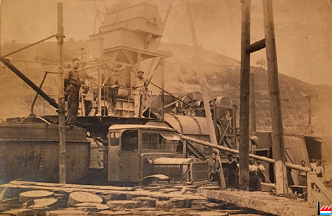 Wéi ee Chantier ass dëst? D'Brëck iwwer d'Nordstreck? Anscheinend handelt sech eng Firma vun Utrecht / Holland. Op der Foto ass ee Liberty-Camion vun der US-Army aus dem 1. Weltkrich ze gesinn. Also ass d'Foto vun no 1918.