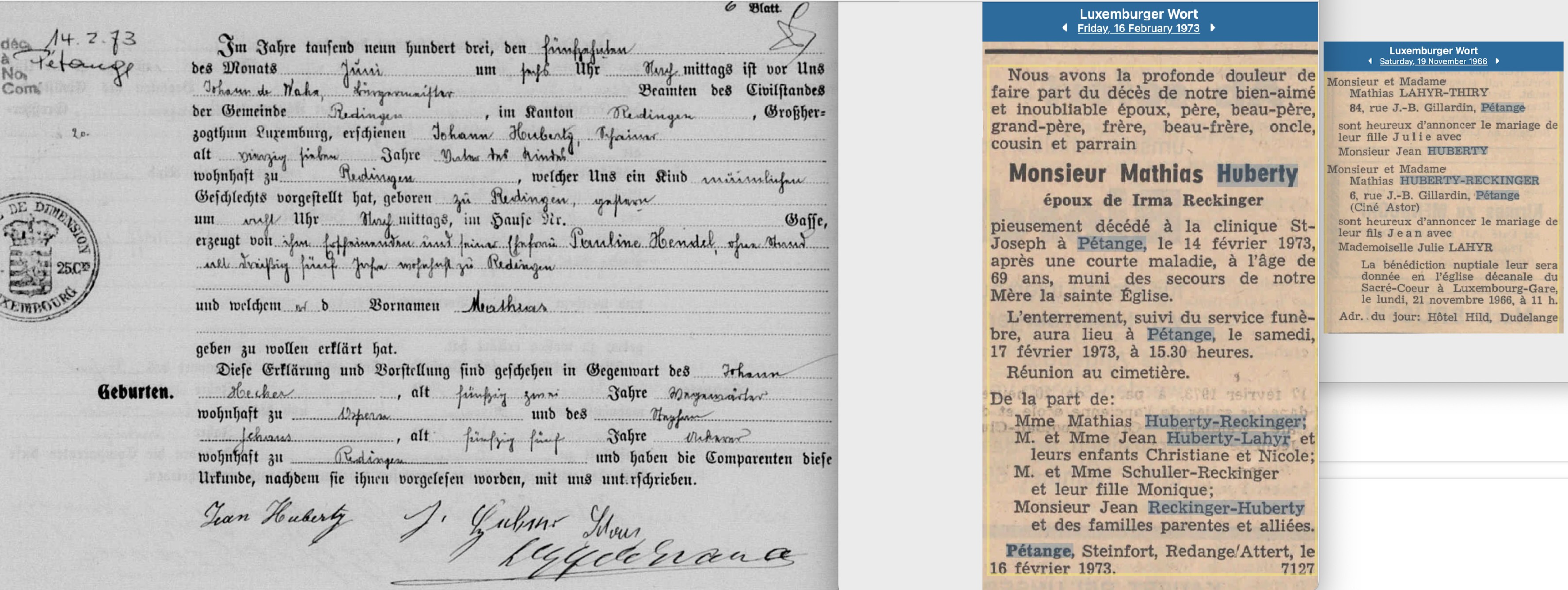 De Mathias Huberty ass zu Réiden den 14.6.1903 op d'Welt komm. Seng Elteren waren den Johann Huberty (Beruf Schräiner) an Pauline Hendel.