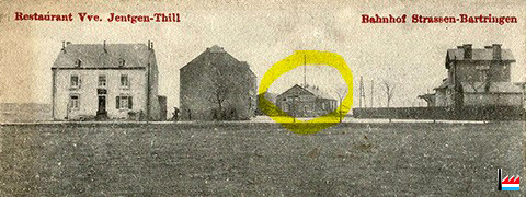 Restaurant Vve Jentgen-Thill - Café de la Station - Kalkmühle Mathias Bauer - Bahnhof Strassen-Bartringen - <=1911 (Extrait de la Carte postale: Kunstverlag Max Löwenthal, Frankfurt/Main, Ostendstrasse 51 - No 400 509 - 8792; collection: industrie.lu)