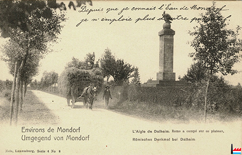 | entre 1902 - 1906 | ![]() Depuis que je connais l'Eau de Mondorf je n'emploie plus d'autre purgatif. - publicité sur (Carte postale: Nels, Luxembourg, Série 4 N° 8; collection industrie.lu) ![]() L'Aigle romain de Dalheim - Rome a campé sur ce plateau - Römisches Adler - Denkmal bei Dalheim (Carte postale: Nels, Luxembourg, Série 4 N° 8; collection industrie.lu) |
