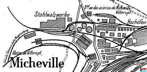 | 1910 | ![]() Usine de Villerupt - Micheville (Übersichtskarte des Erzgebietes bei Deutsch-Oth, Esch und Villerupt - Kaiserliche Eisenbahn-Generaldirektion, Strassburg - 2.1910) Schiefe Ebene mit elektrischem Wagenaufzug Stahlwalzwerke Hochöfen Schlackengleis Schlackenhalde |