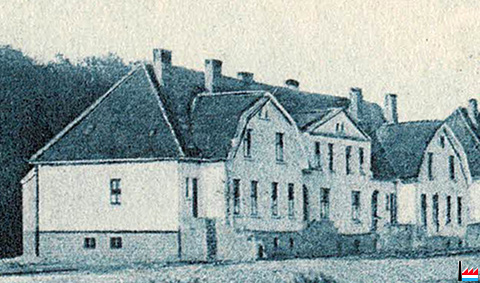 Steinfort - Maisons de l'usine de 1907 avec le crassier à l'avant plan, vers 1920 (Extrait de la carte postale: Manufacture de cartes P. Houstraas, Luxembourg, Rue des Augustins; collection: industrie.lu)